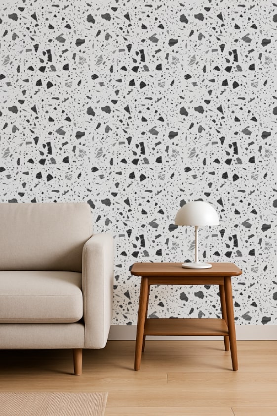 Sophisticated monochrome terrazzo design with bold contrasts, exuding timeless elegance and modern minimalism for refined interiors and architectural statements.