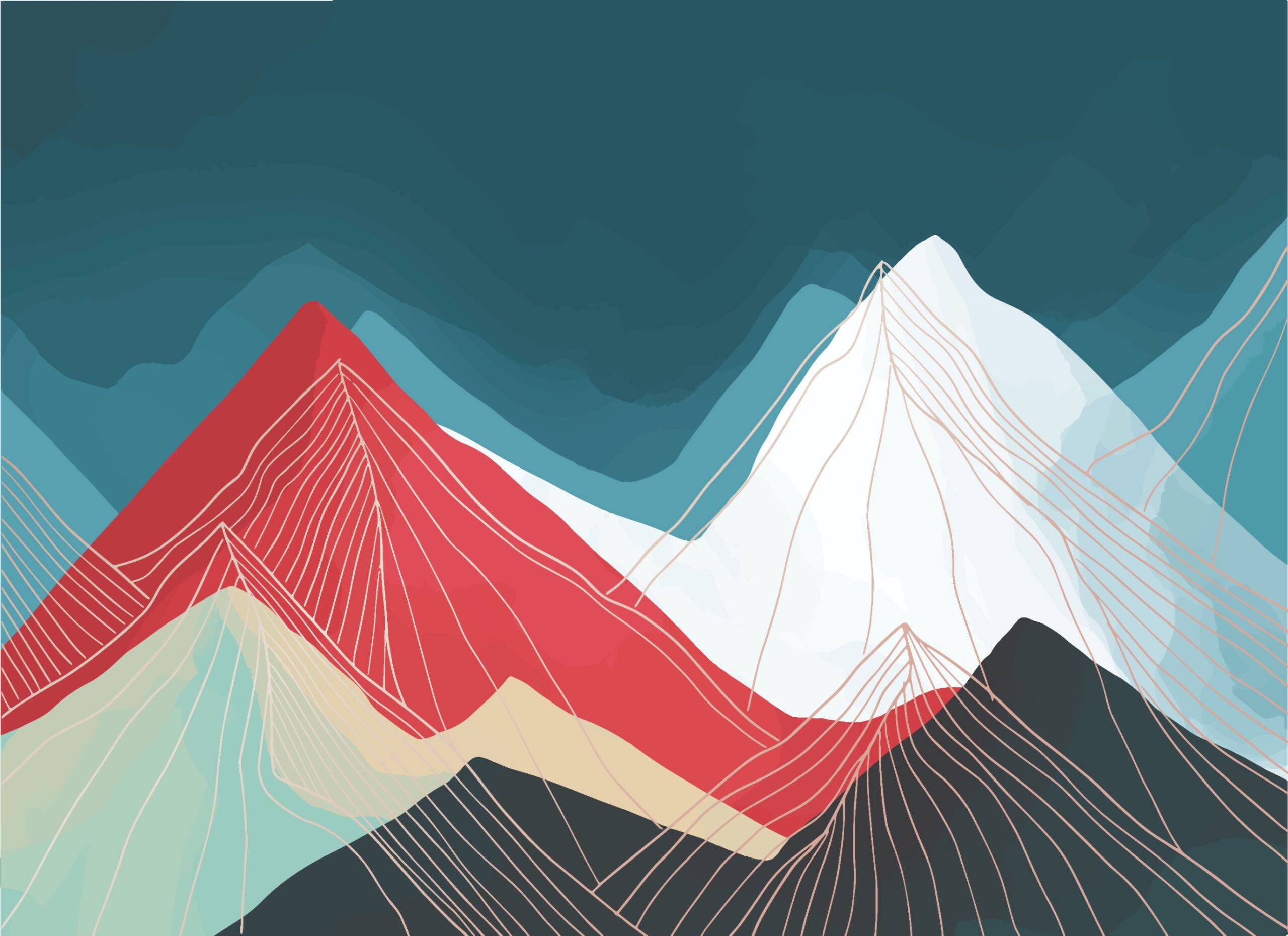 Vivid red and white peaks rise beneath deep teal skies, with elegant linework capturing grandeur, resilience, and modern artistic luxury.