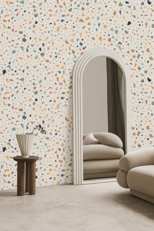 Modern terrazzo-inspired elegance with soft earthy tones, blending timeless sophistication and playful texture for refined, contemporary living spaces.